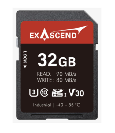 The Exascend Industrial SD300 V30 C10 SD 6.0 32GB (EX32GSDV30-IDE) is a rugged SDXC card for industrial applications, delivering up to 90 MB/s read and 80 MB/s write speeds with V30/U3/C10/A2 ratings for reliable 4K video and burst shooting. Operating from -40°C to +85°C, it features 2,000,000-hour MTBF, up to 1,210 TBW endurance, and input voltage of 2.7–3.6 V—ideal for harsh environments like surveillance, automotive, or embedded systems.