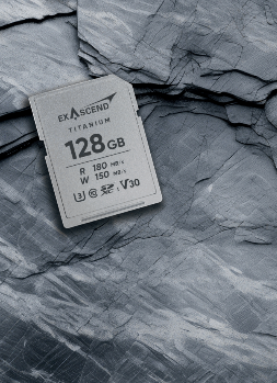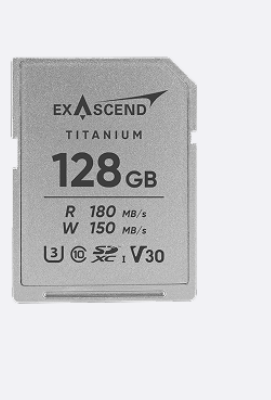 The Exascend Titanium SDXC UHS-I V30 128GB is a rugged, full-metal memory card for professional 4K video and high-speed photography, offering 180 MB/s read and 150 MB/s write speeds with V30 certification for drop-free recording. Bend-resistant up to 200N, heat-dissipating, and backed by a lifetime warranty with data recovery, it operates in -25°C to 85°C environments.
