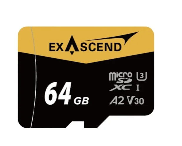 The Exascend EX64GUSDU1-AD Catalyst 64GB microSDXC UHS-I card (with adapter) offers A2, U3, V30 speeds for 4K video and app performance. Rugged design withstands water, dust, shocks, magnets, and extreme temps (-25°C to 85°C), with ECC for data integrity—ideal for outdoor adventures.