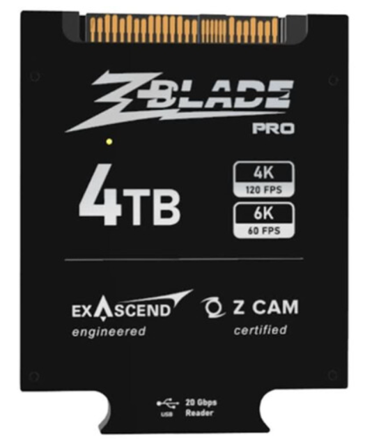 The Exascend EXP4M6G004TB ZBlade Gen4 4TB storage is Z CAM E2-F6 Pro certified, delivering 2400 MB/s read and 1400 MB/s write for drop-free 6K60/ProRes 4K120 video. Built-in 20 Gbps USB-C reader, rugged for extremes (0°C~70°C), with 4000 TBW endurance and 5-year warranty including data recovery.