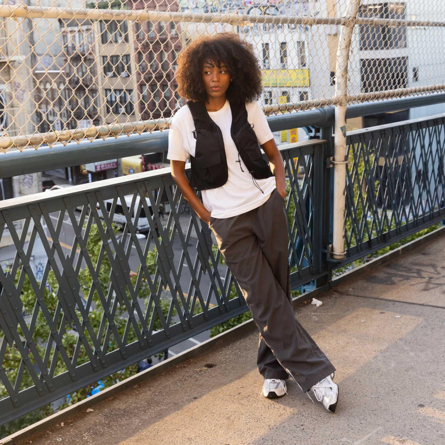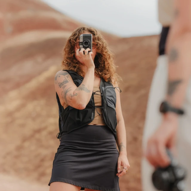 Front straps inspired by vests with a flexible zippered pocket and quick-access stretch pocket for easy access to your camera, film, phone, filters, or snacks.