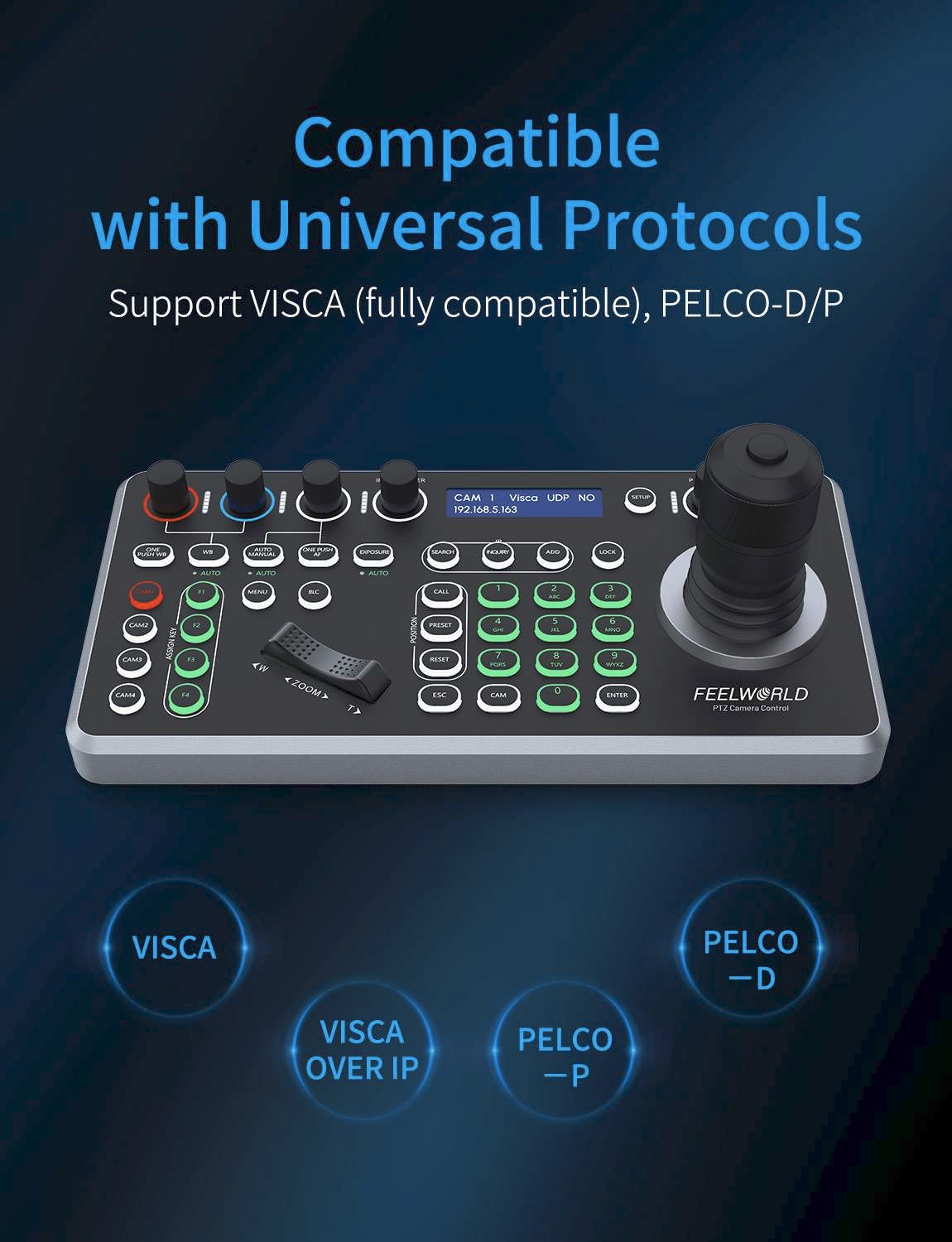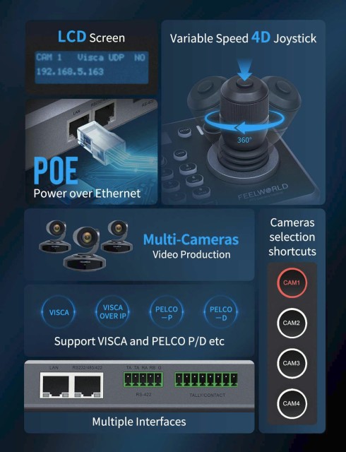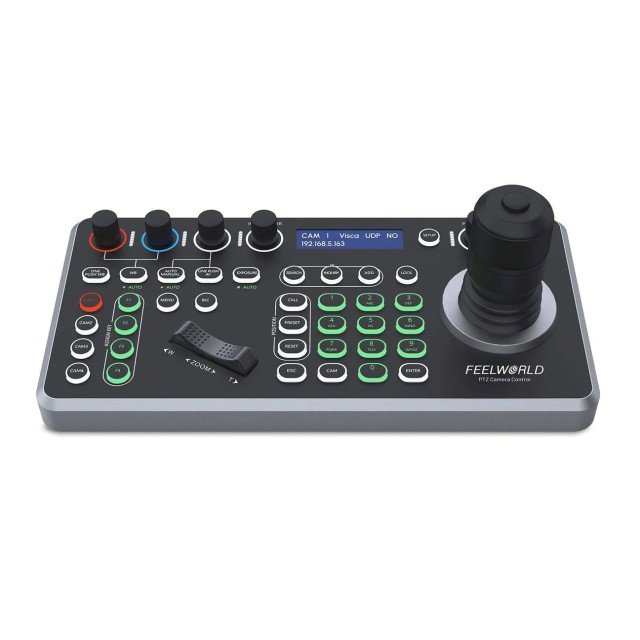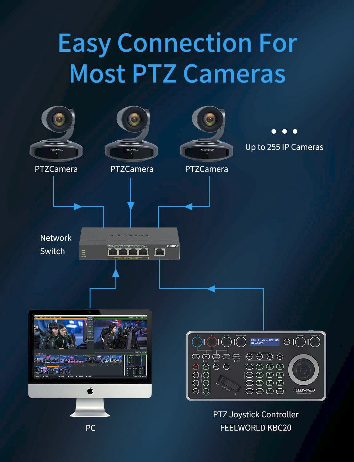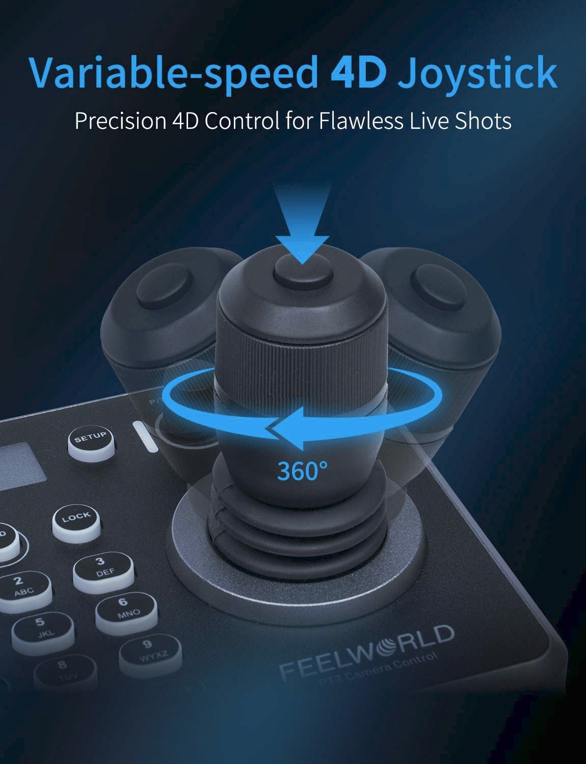 The Feelworld KBC20 is a professional PTZ camera controller designed for multi-camera productions, offering precise 4D joystick control, support for multiple protocols, PoE power, and the ability to manage up to 255 PTZ cameras for live events, conferencing, broadcasting, and education.