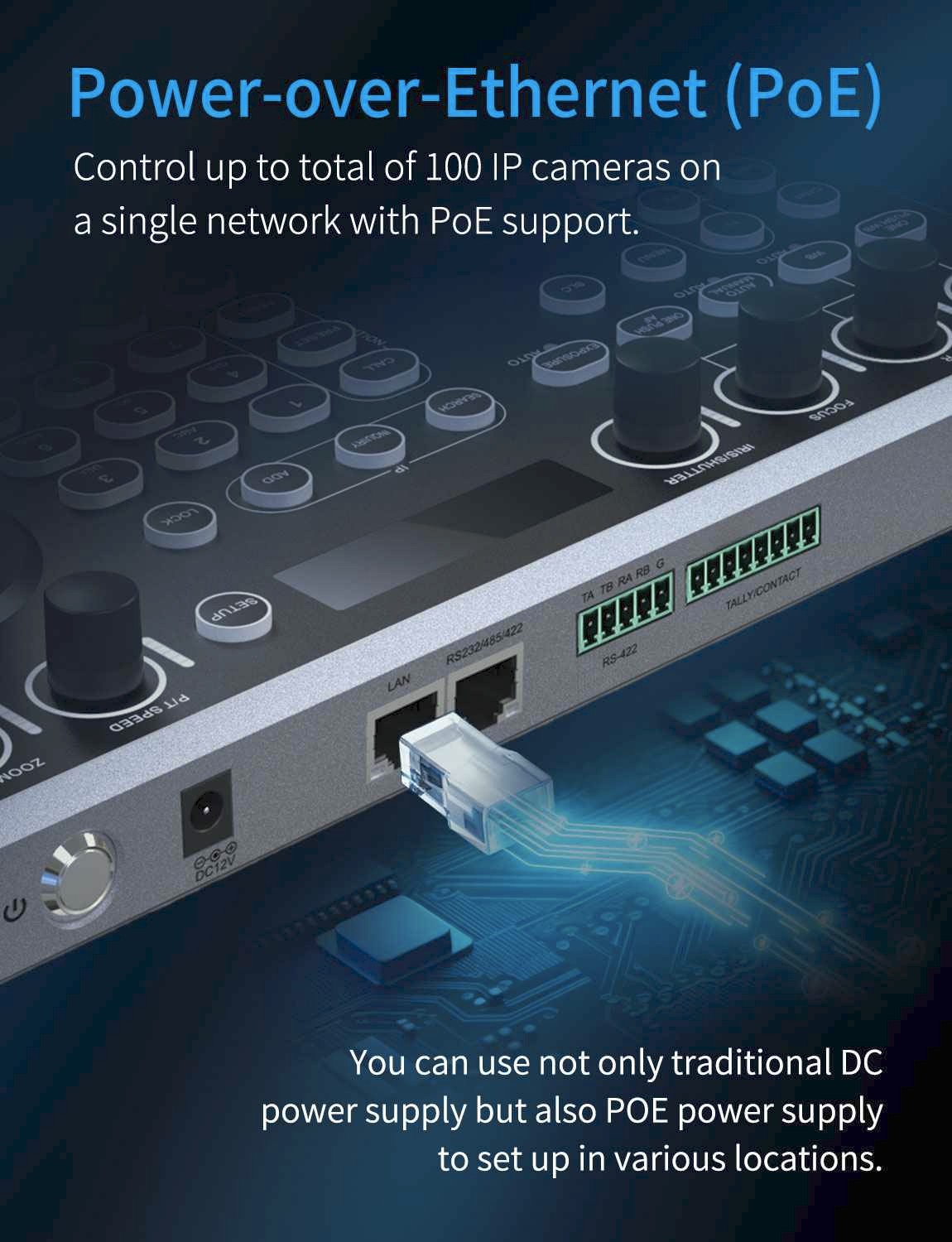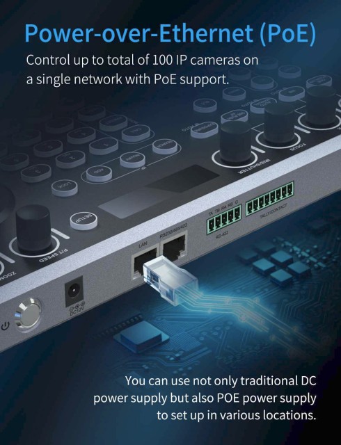 For installation flexibility, the KBC20 offers both network (IP) and analog control modes, with professional interfaces including RJ45 Ethernet, RS232/RS422/RS485, TALLY/contact terminals, and a Kensington security slot. Power can be supplied via PoE, reducing cable clutter and enabling single-cable deployment up to 100 meters when used with an IEEE 802.3af/at compliant switch. Additionally, web-based configuration allows easy camera discovery, network setup, firmware upgrades, and user management.