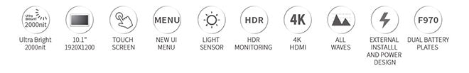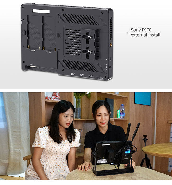 A Sony F970 external install and power kit design is added to the back of the monitor. The external kit can be used to install and install the external equipment, like wireless transmission, LED light, video converter and others that can be powered by a Sony F970 battery. This innovative external power supply design meets the need to power for external wireless transmission, LED light and other equipment, greatly saving the space occupied by the equipment and reducing the weight of photography equipment.