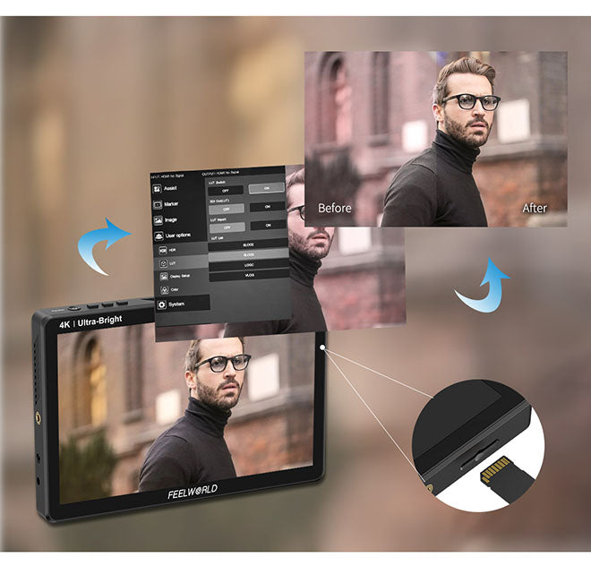 The LUT loading function makes the color calibration easier and more intuitive, optimizes the workflow and improves the work efficiency in the early stage of shooting. You could use built-in LOG or upload .cube files. LUT11H allows you to load internally up to 50 custom LUTs, looks or profiles at any time via the SD Card Slot and instantly select between them, maintaining creative intent, always.