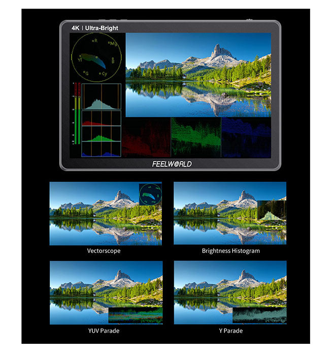 Built-in waveform monitoring, you can choose from waveform (RGB Parade, YUV Parade, Y Parade), vector scope, histogram, audio phase and level displays, and get broadcast accurate waveform monitoring that shows everything you need to know technically about your video and audio signals. The functions can be opened separately, and also support one key to open all scope mode. LUT11H becomes the ideal choice for live production monitoring, so you no longer need to use a separate expensive scopes!