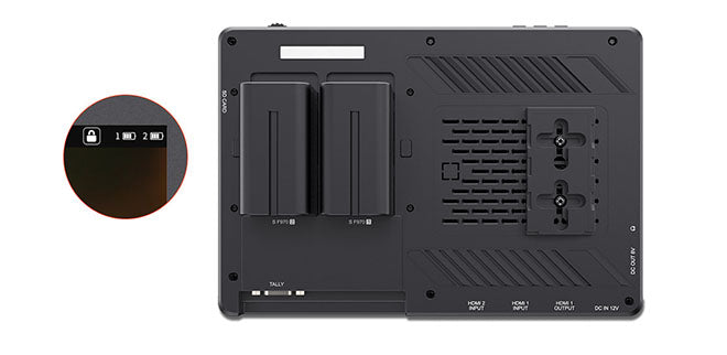 The rear of monitor of LUT11H have dual battery plates, can install two standard NP-F batteries, long-lasting power for your screen. In addition, you can switch the battery quickly, just double tap the battery icon on the upper right corner of the monitor about 3 seconds to finish the switching, and don’t worry interrupting monitoring. Install one F970 battery (6600mah) last for about 2 hours, and install two F970 batteries last for about 3.5-4 hours. You can choose install 1 or 2 battery base on your need.