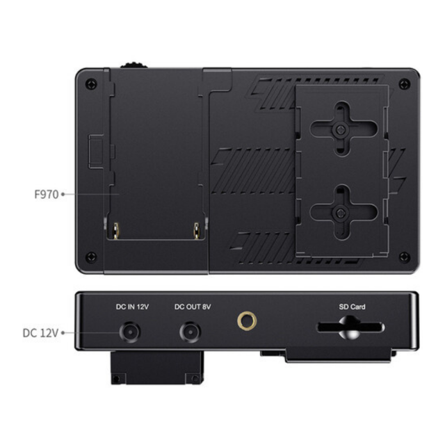 A Sony F970 external install and power kit design is added to the back of the monitor. The external kit can be used to install and install the external equipment, like wireless transmission, LED light, video converter and others that can be powered by a Sony F970 battery. This innovative external power supply design meets the need to power for external wireless transmission, LED light and other equipment, greatly saving the space occupied by the equipment and reducing the weight of photography equipment.