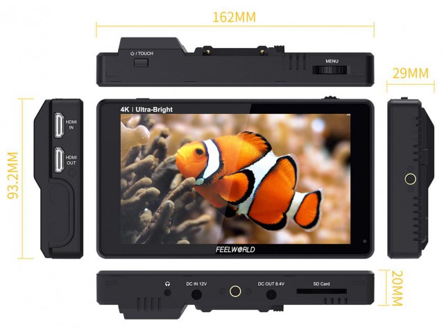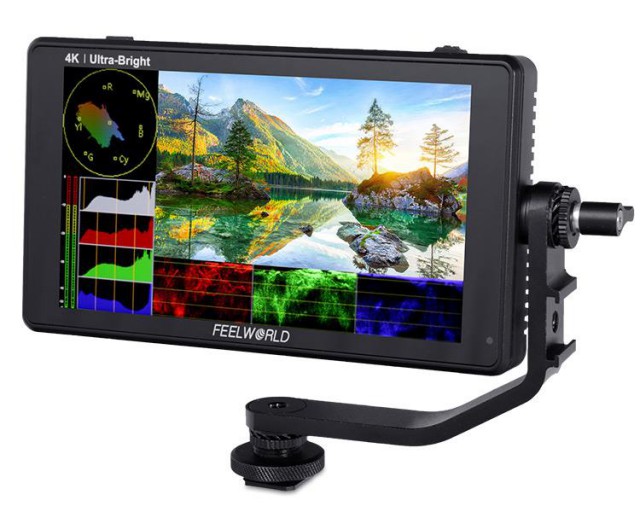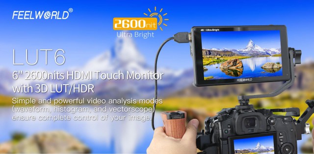 6" high-brightness (2,600 cd/m²) camera monitor with touchscreen and support for 3D LUT correction (integrated HLG 2020, HLG 709, HLG P3 HDR 3D LUT and Rec709 De-slog3/SLog2, SLog3, LogC, V-Log presets; or import your own up to 50 LUT files via SD card). Comes with LUTs, LUTs, LUTs, and LUTs with multiple LUTs. Mini/Micro HDMI-HDMI cable and mounting bracket. LUT6 variant with 4K HDMI I/O.