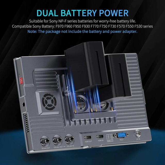 You can connect to DC power input to get continuous power (suitable for DC 5.5*2.1mm power plug) or use the standard F970 dual battery plate to install NP-F series battery for mobile application. Install one F970 battery (6600mah) last for about 2 hours. The upper right coner of monitor will display battery level after the battery installed two batteries are installed at the same time, when one is running low, you can quickly switch to the other one without worrying about losing power midway. The V-mount battery plate is for optional.