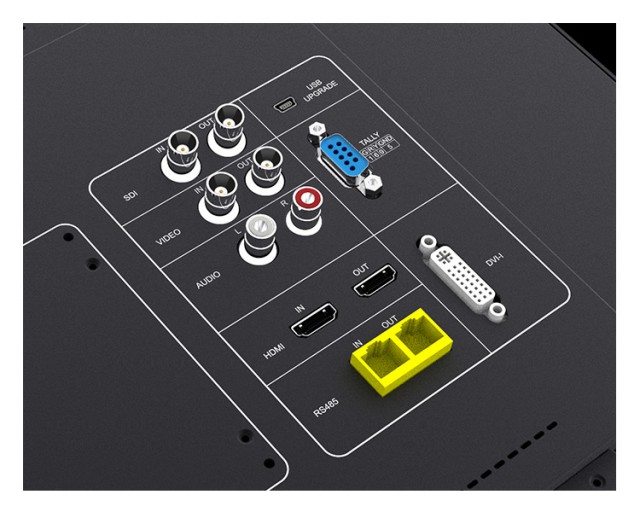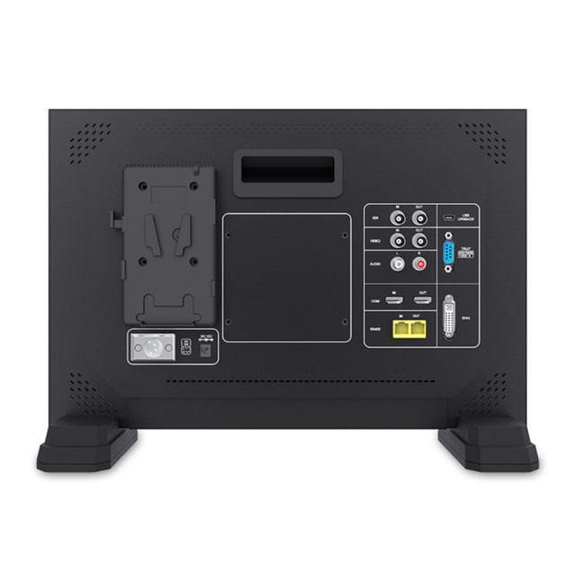 High-end overhead monitor with 17.3 IPC LED panel (1920x1080, 16:9, 300 cd/m², 178° viewing angles) and 1x 3G-SDI, 1x 4K HDMI, DVI, RS-485 and audio (L/R) inputs. The monitor also offers signal commands display (UMD and Text-Tally; TSL 3.1/4.0), 3G-SDI/HDMI outputs, integrated speaker, headphone output, V-Mount battery plate (optional Gold Mount), power input with XLR4 connector, and rugged aluminum bezel. Of course, there are features for focus assist, zoom, pixel-to-pixel, image rotation, half-frame checking, etc. Optionally, a customized aluminum case can be supplied.