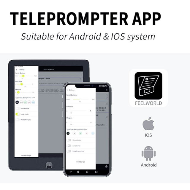 Universal Feelworld TP13 teleprompter supports smartphone/tablet prompting (supports tablets up to 11“) and smartphone/DSLR/DSLM shooting thanks to its well thought out clamps as well as adjustable holder (up to 6 cm). It also features removable cloth sun shield, foam rings, and Bluetooth remote controller that communicates with Feelworld’s Android/iOS apps.