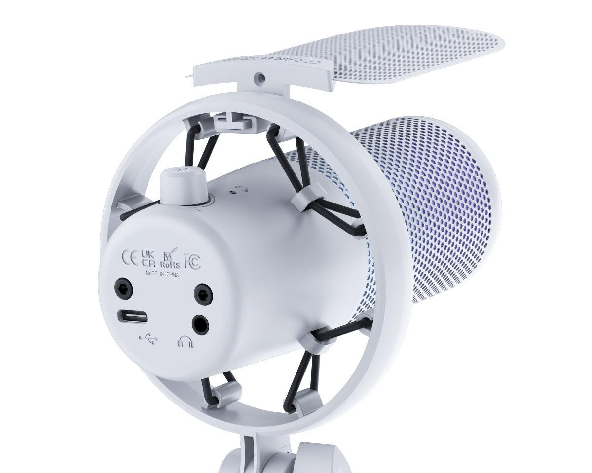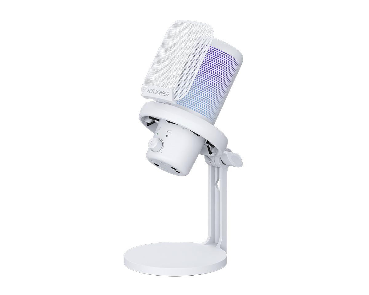 The Feelworld VM1-XS-W is a plug-and-play USB condenser microphone with a clean white finish, perfect for streaming, gaming, and podcasting. It features a cardioid polar pattern for clear audio, a dedicated one-key mute/noise cancellation button, customizable multi-mode RGB lighting, and an included desktop stand.