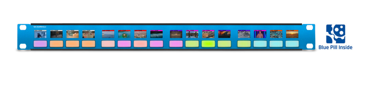 The SKAARHOJ Frame Shot Uno with Blue Pill Inside is a professional 1RU rack-mounted universal control panel featuring 16 programmable RGB buttons with animated displays, designed for flexible video switching and source control in broadcast environments.