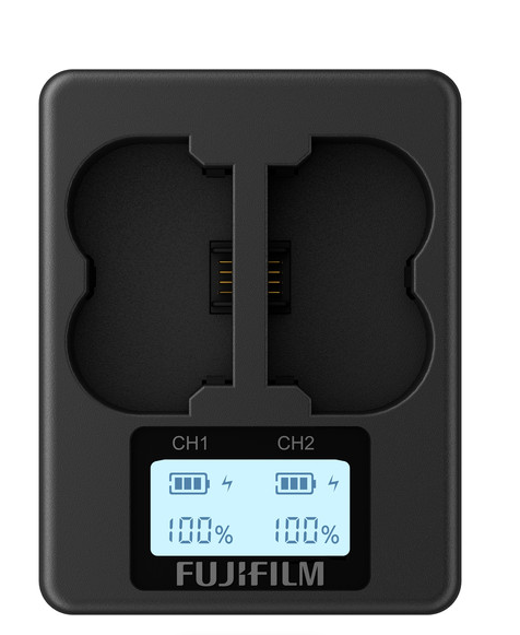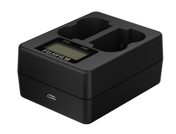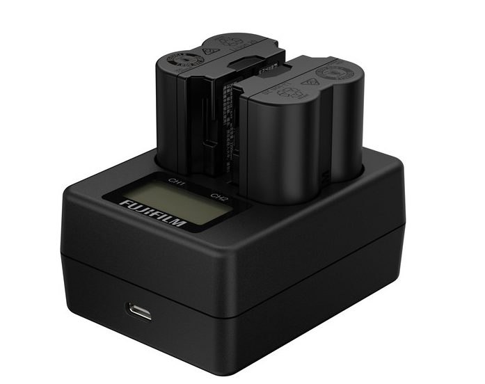 Charges two Fujifilm NP-W235 batteries simultaneously or independently