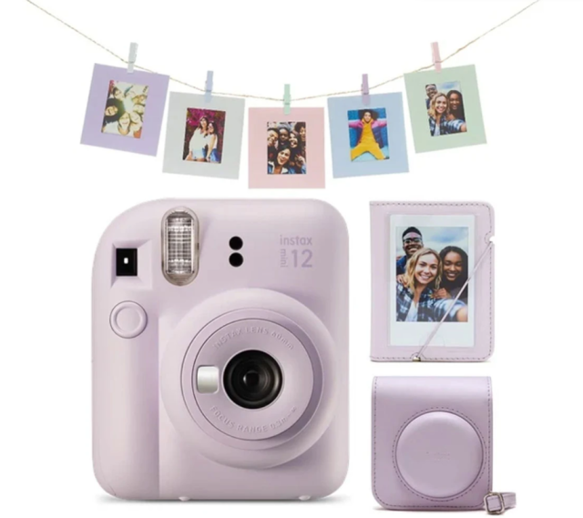 The Fujifilm Instax Mini 12 Mega Pack Lilac Purple is a complete instant photography kit for beginners, featuring a compact and stylish lilac purple camera, a protective case, a 28-photo album, colored pegs, and two packs of Instax Mini instant film (20 sheets total) for capturing and displaying your favorite memories instantly.