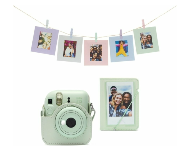 The Fujifilm Instax Mini 12 Accessory Kit – Mint Green is a color-coordinated accessory set designed specifically for the Instax Mini 12 camera. It includes a protective camera case, a 29-photo album, and a creative photo display kit with clips and hanging string—perfect for storing and showcasing your instant memories.