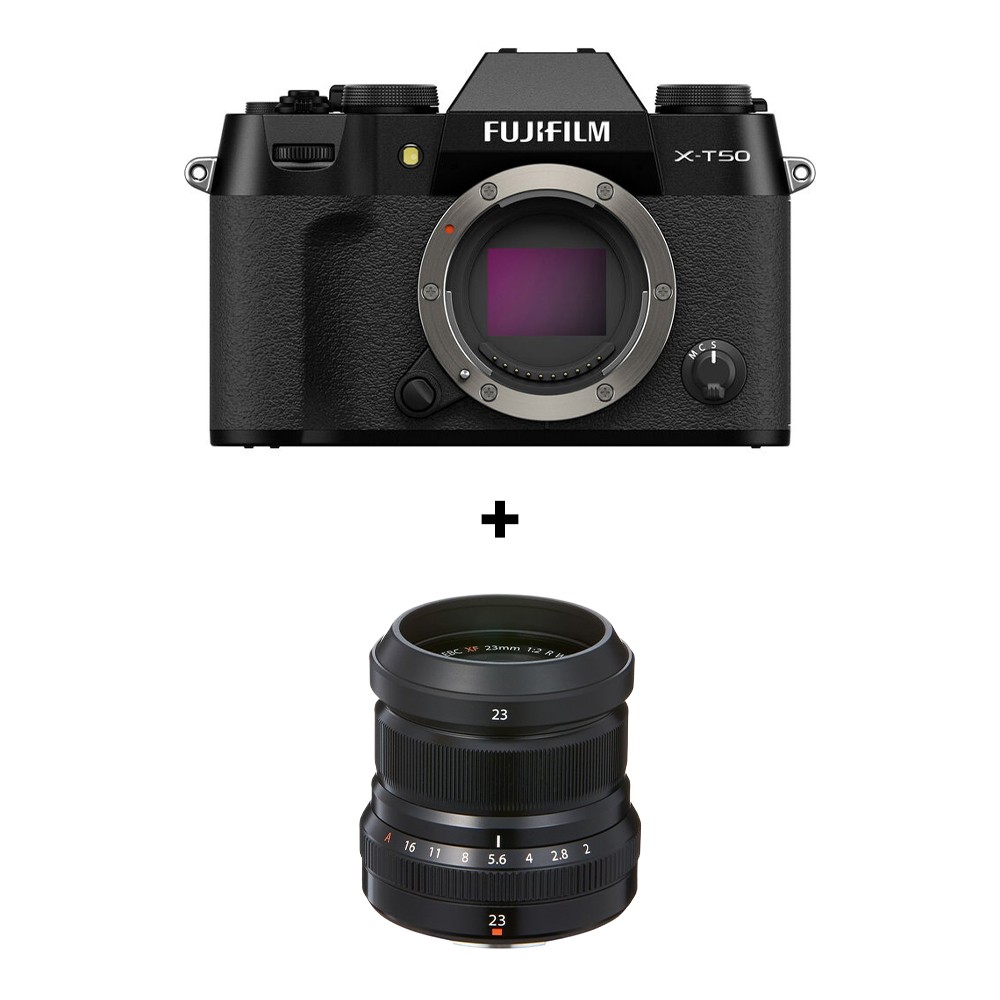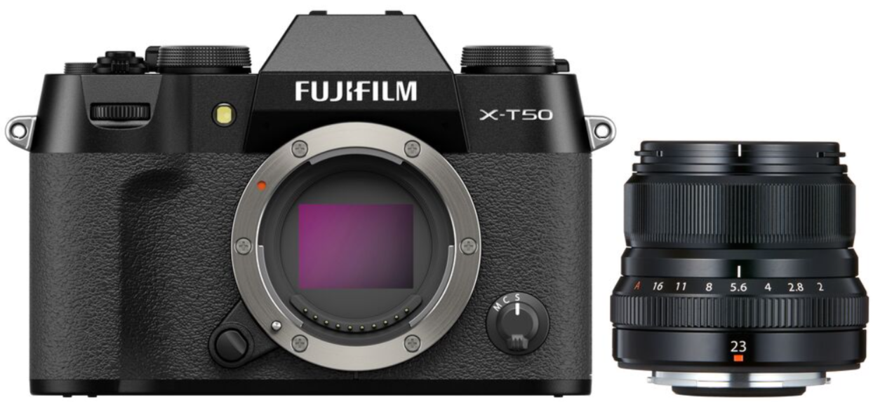 The Fujifilm X-T50 Black is a lightweight APS-C mirrorless camera inspired by rangefinders (123.8 × 84 × 48.8 mm, 438 g with battery/SD card) equipped with a 23.5 × 15.6 mm X-Trans CMOS 5 HR sensor with a resolution of 40.2 MP and an X-Processor 5 processor, which allows you to capture 14-bit RAW images with a resolution of 7728 × 5152, native ISO 125–12,800 (ext. 64–51,200) and ultra-fast electronic shutter speeds of up to 1/180,000 s for precise exposure control. Video features include 6.2K/30p open-gate 3:2 (200 Mb/s, 10-bit H.265), 4K/60p, and FHD/240p slow-motion footage with full sensor readout, supported by digital IS + IS Boost for stability when handheld. The 425-point hybrid phase/contrast AF system works down to -7 EV with deep learning AI object recognition (people, animals, birds, vehicles, aircraft, insects, drones) and tracking. A dedicated film simulation dial on the top plate provides instant access to 20 modes, including REALA ACE and Nostalgic Neg., with three custom slots; AUTO mode automatically selects settings using object recognition. 5-axis IBIS offers up to 7 stops of compensation (CIPA, tilt/yaw with XF35mm f/1.4), while the 0.39" 2.36M-dot OLED EVF (0.62× magnification, 100 fps) and 3" 1.84M-dot vari-angle touchscreen (touch AF/control) facilitate creative angles. Connectivity includes USB-C 10 Gbps (charging/data), micro-HDMI (12-bit RAW output), Wi-Fi 4, Bluetooth 5.2, and a 2.5mm jack for microphone/remote control; storage is provided by two UHS-II SD slots. A built-in flash (GN 5) and TTL hot shoe support external lighting. The NP-W126S battery provides ~305 shots (CIPA LCD). Combined with the XF 23mm f/2.0 R WR lens, it forms a versatile kit for street photography with durable, fast optics.