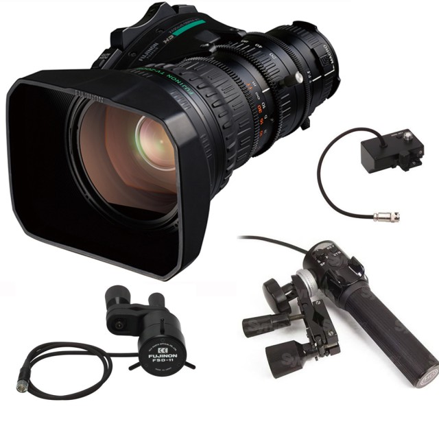 The Fujinon XA20sx8.5BRM HD Professional Lens KIT ( included zoom/focus controller (FSD-11) (SRD-92B) (FSM-30B)) is an ENG telephoto lens designed for 2/3" cameras. It has a 20x zoom, a focal length ranging from 8.5 to 170mm, and features a relative aperture ranging from 1:1.8 between 8.5 and 113mm, and 1:2.7 at 170mm. With advanced glass properties, it reduces the effect of color fringes that occurs due to the failure of a lens to focus all colors to the same convergence point. Most afordable, cost-effective lens for Blackmagic Design URSA Broadcast.