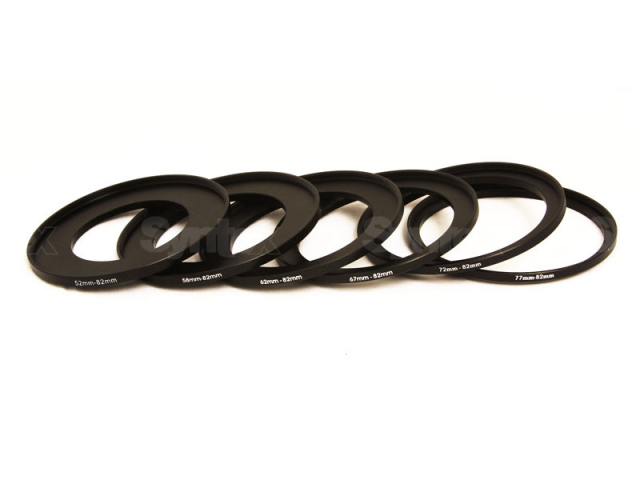 A set of five different 77 mm step up rings . Allowing the use of 77mm filters and accessories on lenses with 52mm,58mm, 62mm, 67mm, and 72mm filter threads.