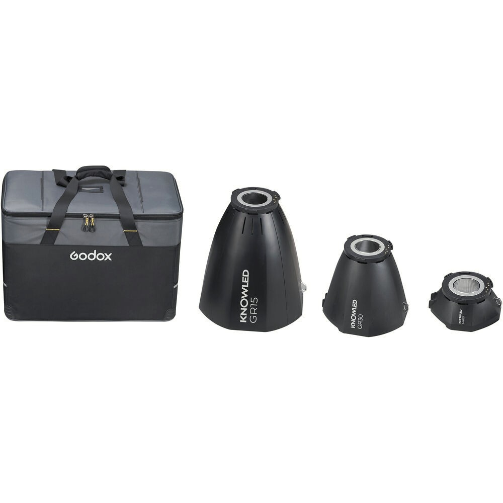 Control your lighting with precision using the Godox Knowled Narrow Angle Reflector Kit, featuring 15°, 30°, and 60° reflectors for MG1200BI, MG2400BI, MG1200R, and MG2400R lights. Silver interior surfaces ensure optimal light reflection, while the quick-twist mounting and included carry bag make setup and transport effortless.