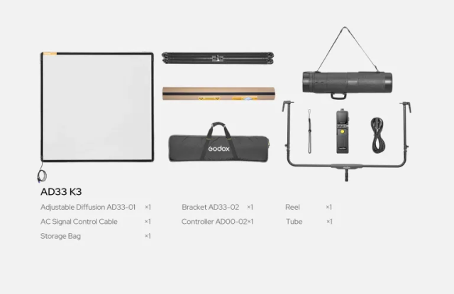 The Godox Knowled AD33 K3 Adjustable Diffuser Kit is a professional motorized diffusion system designed for modern film, video, and photography workflows. With its collapsible large-format frame, precise motorized diffusion control, multi-power compatibility, and advanced flicker-free technology, it delivers unmatched flexibility for shaping soft light on set. Complete with wireless control options, DMX/RDM support, and a compact storage bag, the AD33 K3 is an essential tool for dynamic, fast-paced productions.