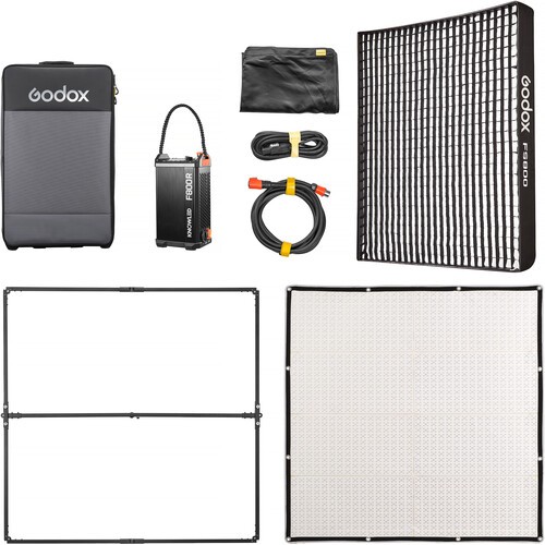 Kit Contents (K1): F800R Panel, Controller Box, Metal Bracket (for mounting), Softbox with Grid, Cables, Carry Case.