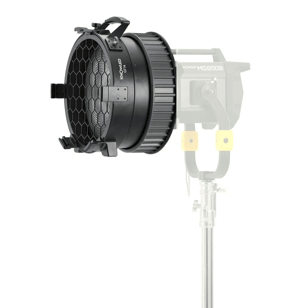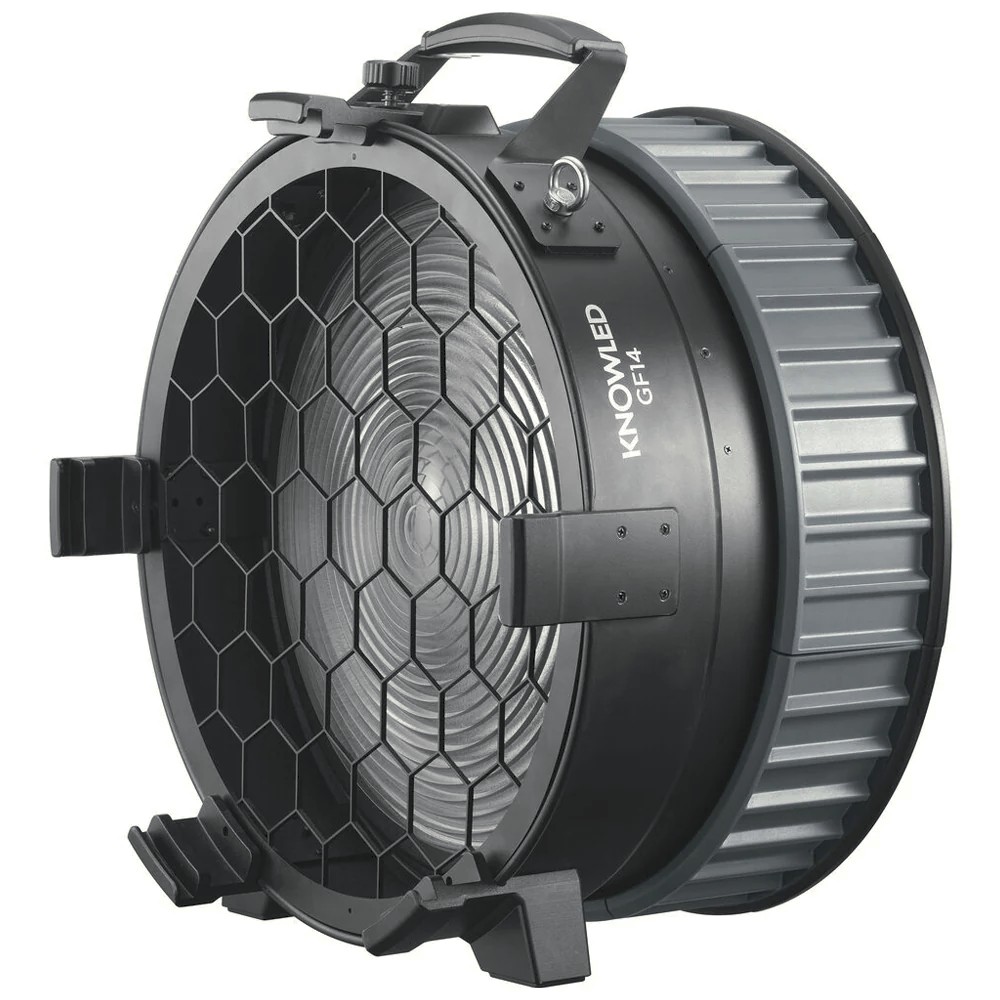Featuring a 15° to 45° adjustable beam angle, the GF14 allows precise control over light spread, from tight spot to wider flood, while minimizing unwanted light spill. Its optical design maintains consistent light quality and works seamlessly with optional barndoors for even greater control. Built with a sturdy, production-ready housing, the GF14 is designed to withstand demanding studio and on-location environments. This Fresnel lens is an essential accessory for cinematographers seeking maximum output, control, and efficiency from their KNOWLED fixtures.