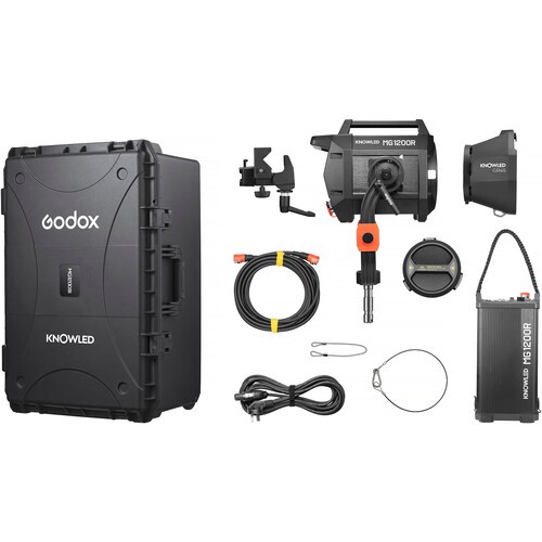 The Godox KKnowled MG1200R RGB LED Monolight Kit delivers professional-grade, full-color lighting with unmatched versatility. Featuring a wide 1800–10,000K color range, advanced RGB control, and 21,300 lux output at 9.8', this AC-powered fixture offers DMX, CRMX, app, and Ethernet control. Designed for filmmakers and photographers, it comes with a 45° reflector, proprietary G-mount compatibility, and a durable IP65-rated housing, all packed in a protective hard case for easy transport.