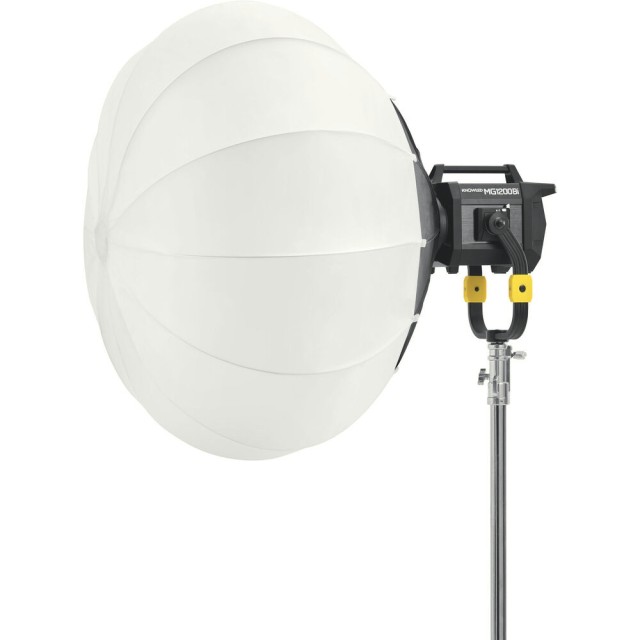 The Godox Knowled G-Mount 90cm Lantern Softbox is engineered to provide soft, 360° wraparound lighting for cinematographers, videographers, and photographers using the MG1200BI, MG2400BI, MG1200R, or MG2400R fixtures. Designed specifically for the proprietary Godox G-mount system, this 35" spherical softbox ensures perfect compatibility without the need for additional adapters. Its white interior enhances diffusion for clean, natural light, while the durable construction—featuring polyester and fireproof cotton—ensures long-lasting performance in demanding production environments. Ideal for lighting entire rooms or creating smooth, ambient fill, the lantern also includes a detachable skirt for directional control, giving users the flexibility to shape and limit spill as needed. Whether used on film sets, broadcast locations, or photography studios, this lantern softbox provides reliable, high-quality results with effortless setup and breakdown.