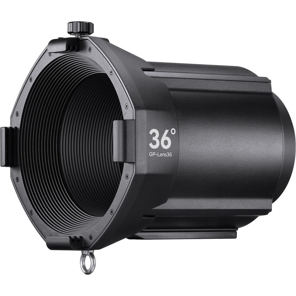 The Godox Knowled GP36K 36° Lens is a professional projection lens engineered for the Godox G-Mount system. This fixed 36° lens provides a uniform, controlled beam with sharp edges, increased brightness, and minimal optical distortion, making it perfect for gobo projection, spotlighting, and other precise lighting applications in photography, film, and stage productions. When paired with the MG1200Bi LED monolight, the GP36K can amplify light output by up to eight times, delivering high-intensity illumination for demanding projects. The lens housing is designed for quick, secure installation and removal from the G-Mount, ensuring versatile and efficient use on set. Suitable for cinematographers, photographers, and lighting designers, the GP36K 36° Lens enhances creative lighting possibilities with clarity, precision, and superior brightness.