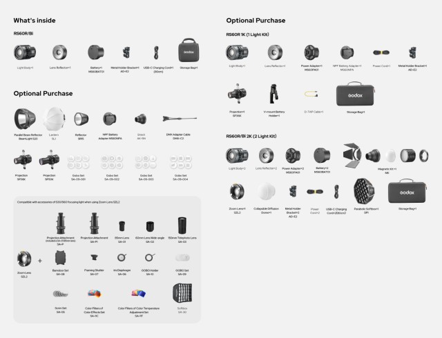 Each kit comes with reflectors, mounts, a zoom lens, power adapters, USB-C cables, and rechargeable batteries, making it ready for immediate use. The durable metal construction, lightweight design, and portable handgrip mounts ensure effortless setup and transport, perfect for live events, studio work, or on-location shoots.