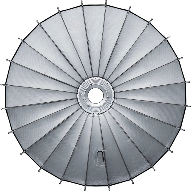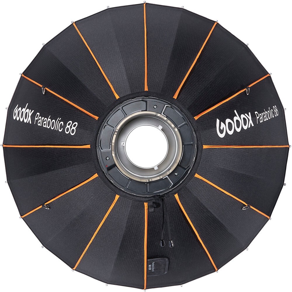 The Godox Knowled Parabolic 88 is a premium parabolic focusing reflector designed to deliver highly controlled, high-contrast lighting with striking specular highlights. Featuring a 35.4" front diameter and deep parabolic shape, it produces a focused yet wraparound light quality ideal for fashion, beauty, and portrait applications. Its silver interior maximizes output and contrast, while the black exterior reduces light spill for superior directional control. Built with 24 durable rods and a proprietary mounting shaft, the Parabolic 88 ensures rigidity and consistent shaping during use. This reflector is a powerful tool for photographers seeking a professional, controllable light source with signature crisp falloff and dynamic character.