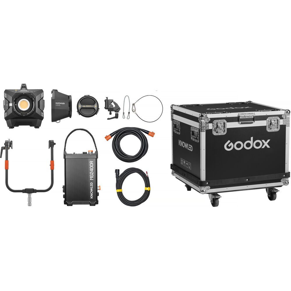 The kit comes complete with a reflector, AC power supply/controller, yoke mount, and a rugged flight case for secure transport. High-intensity output and optimized optics ensure even, clean beams, making the MG2400R ideal for high-frame-rate filming, cinematic setups, and professional studio applications.