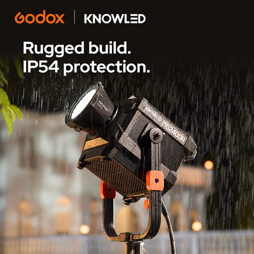 Designed for versatility, the MG2400R includes Godox’s proprietary G-mount for a wide range of light modifiers and supports wireless and wired control via CRMX, DMX, Art-Net, Ethernet, Bluetooth, and the Godox KNOWLED mobile app. Built with an integrated cooling system and IP65-rated for dust and weather resistance, this light performs reliably in both indoor and outdoor environments.