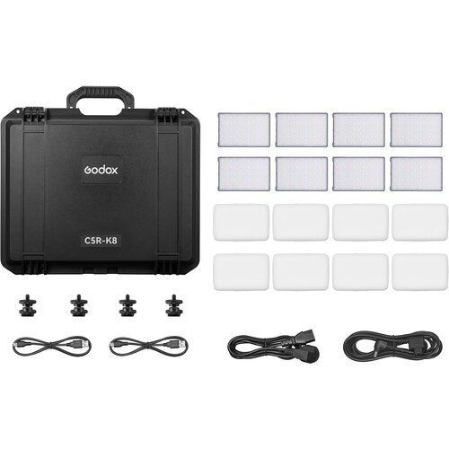 The Godox Knowled C5R-K8 RGBWW Creative Bulb Battery Kit is an 8-light portable LED solution designed for photographers and videographers seeking versatile, high-quality lighting. Each light offers adjustable 2500–8500K color temperature, 0–100% dimming, 39 creative effects, and can be controlled via onboard LCD or Bluetooth app. The included charging case stores, powers, and transports all eight lights for convenient on-the-go use.