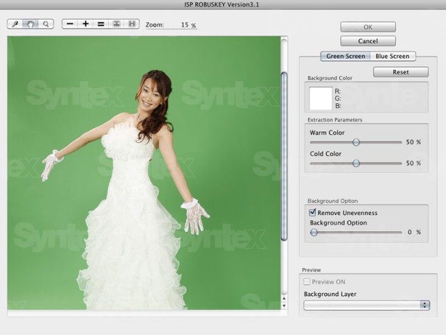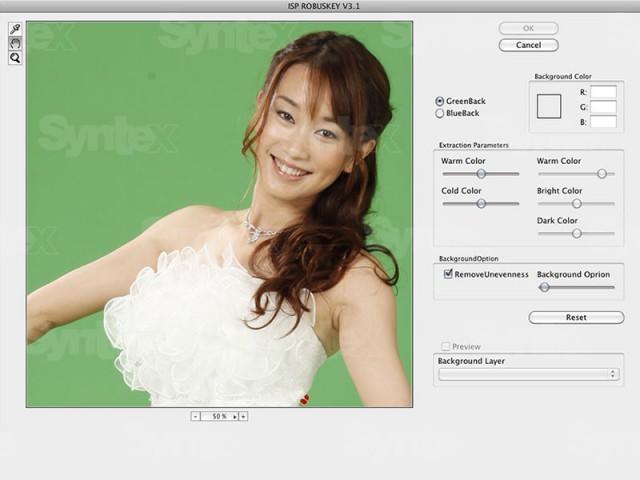 ROBUSKEY for Video is plug-in for Adobe After Effects, Adobe Premiere Pro, Apple Final Cut Pro and Grass Valley EDIUS. The plug-in was created in response to requests from creative professionals for a tool that would make it easier to cut out a background and create more visually appealing composites. Matting is possible even if the video is shot under non-ideal conditions, such as weak lighting, wrinkles or shadows on the background, or too small of a background. Matting work and time are cut considerably. The plug-in can be used not only when editing the video but also when actually shooting it.