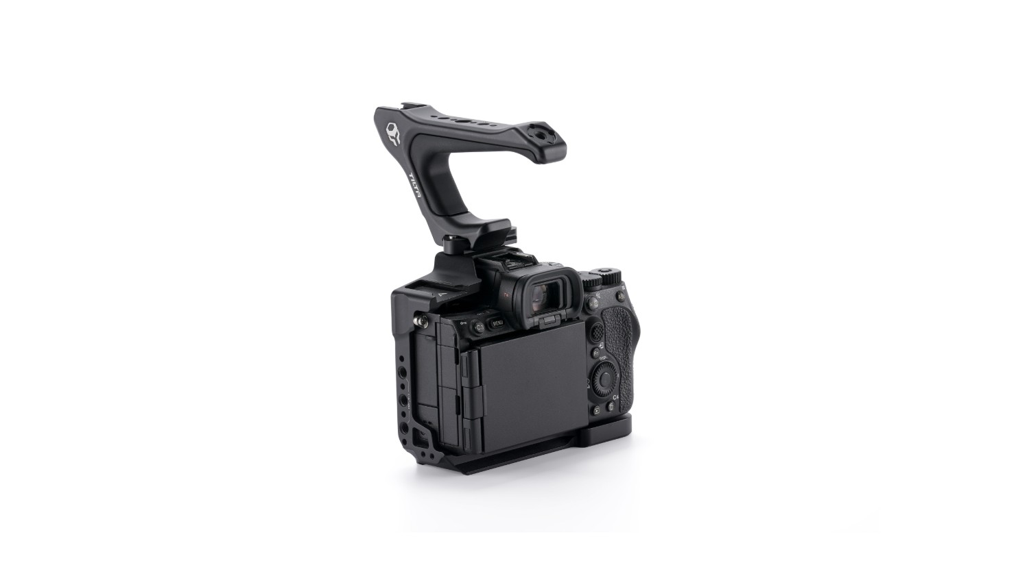 The lightweight kit includes the Xeno Top Handle, which attaches via a 1/4-inch-20 thread to the cages top plate, offering enhanced grip for two-handed operation and low-angle shots. This elegant handle features additional mounting points, including multiple 1/4-inch-20 threads and its own cold shoe receiver, ideal for external monitors or lights. Its increased clearance design improves flexibility without compromising the setups streamlined profile.