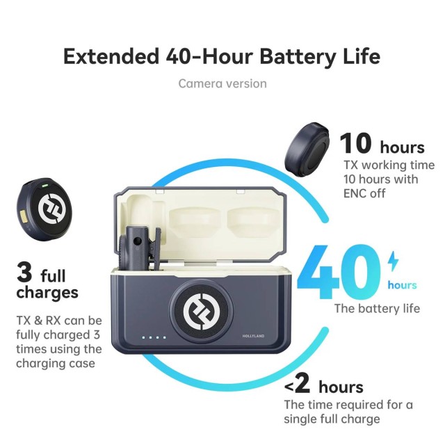 With optimized power management and operational efficiency, the LARK M2 can run continuously for up to 10 hours, so users can focus on creating great content without worrying about battery life. The compact and portable charging case can charge the entire kit twice in less than 1.5 hours. The camera version provides up to 40 hours of total runtime, while the mobile version has a 30-hour battery life with the charging case. The system can also be charged while in use.