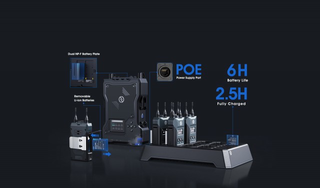 Each beltpack is equipped with 2 removable Li-ion batteries which can be charged independently and are fully charged in only 2.5 hours. With a 6-hour runtime for each battery, the beltpack will never be out of power when using the two batteries in turn.