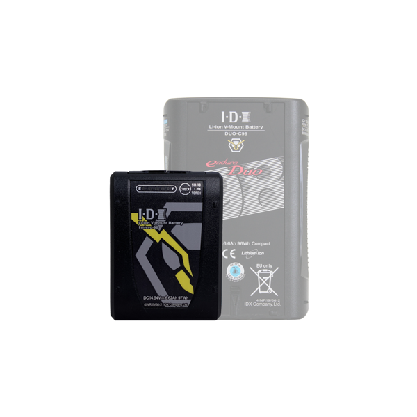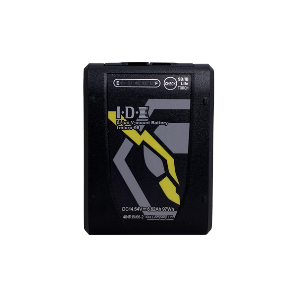 The IDX Imicro-98P is a compact V-mount battery with a large capacity. It has one D-Tap and one USB-C output.