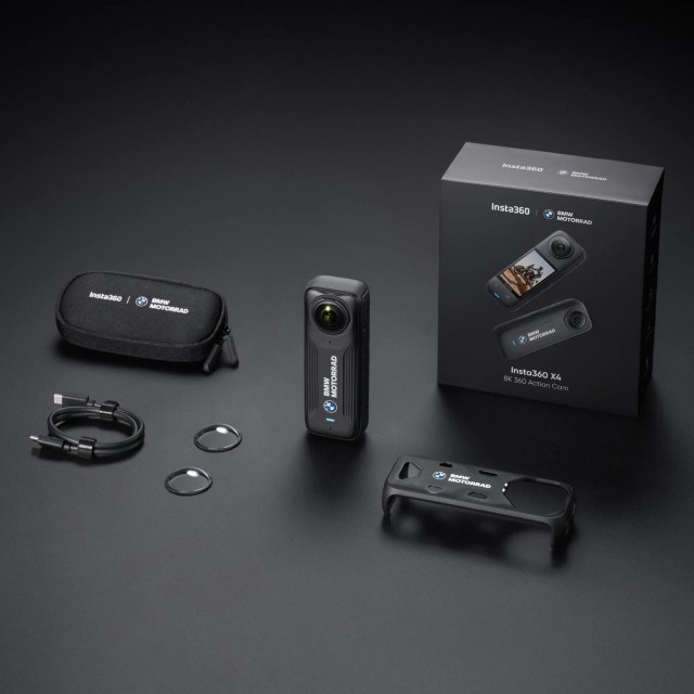 Limited BMW edition Insta360 X4 360° action camera with 1/2'' sensor. 360° video resolution is 8K / 30fps, up to 100 fps at 4K. Photo resolution up to 72Mpx. High quality rugged construction, large 2.5" touch screen, waterproof to 10m. Effective FlowState stabilization with 6-axis gyroscope. New battery with large 2290 mAh capacity. Gesture control, voice control 2.0. Video modes Video, Active HDR, Timelapse, TimeShift, Bullet Time, Loop Recording, Pre-recording. Camera size: 46 x 123.6 x 37.6mm