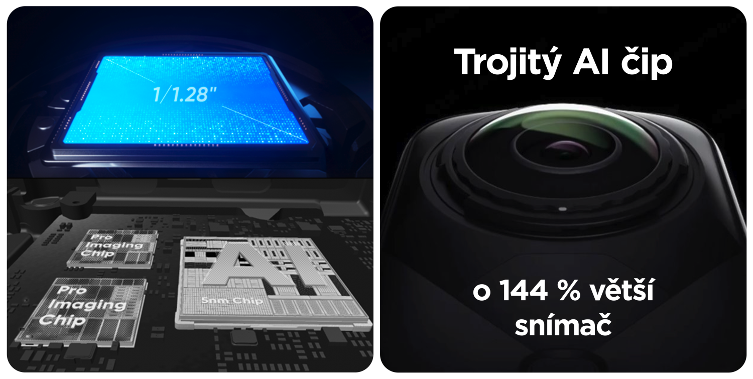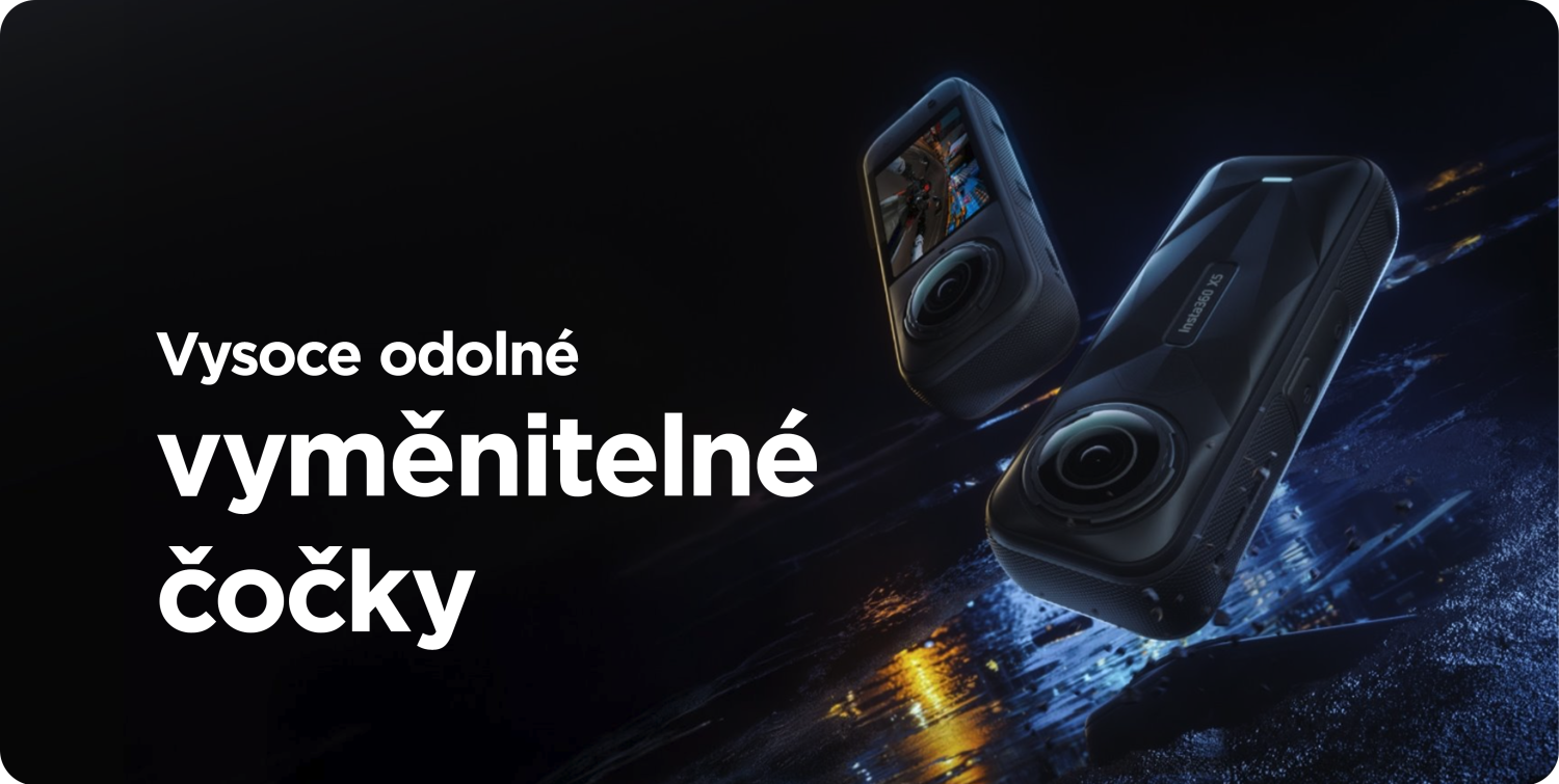 Insta360 X5 action 360° camera with 1/1.28" sensor and triple AI chip. 360° video resolution up to 8K/30fps, 4K up to 120 fps. Photo resolution 72 Mpx. Waterproof up to 15 m, 6-axis FlowState stabilization, 180 Mbps bitrate, improved night mode. 2400 mAh battery with up to 185 min battery life. Offers InstaFrame mode for instant sharing, improved audio with new built-in wind protection. Features durable and replaceable lenses. Camera dimensions 46 x 124.5 x 38.2 mm. The package includes an action invisible selfie stick, 128 GB microSD memory card, FlexiCare for 2 years, portable case, USB C/C cable, lens cleaning cloth, cleaning stickers.