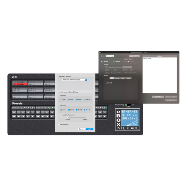 - eBOX can act as a GPI to Serial converter - each of the 24 GPI Inputs can be assigned to send P2 or