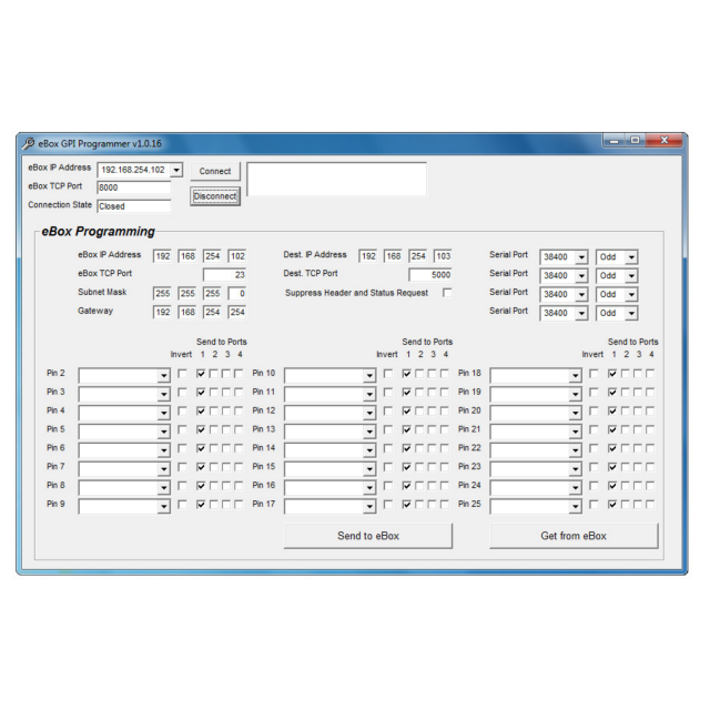 Port direction can be configured as DTE or DCE on each port independently. In addition, the eBOX can operate as a GPI to Serial Converter or GPI to Ethernet Converter. In these modes, the unit will convert GPI input triggers to deck commands.