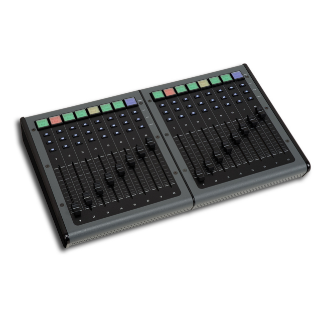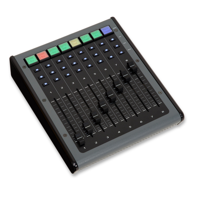 The black Eclipse MXL Midnight 8-Channel Fader Expander with LCD Buttons from JLCooper is a professional fader controller, featuring 8 high-quality, touch-sensitive, 100mm motorized faders, 8 high-resolution backlit LCD display buttons, and 24 illuminated pushbuttons. It displays channel labels, color coded track arming status and other mission critical information. It is a standalone controller for use with a computer-based application.