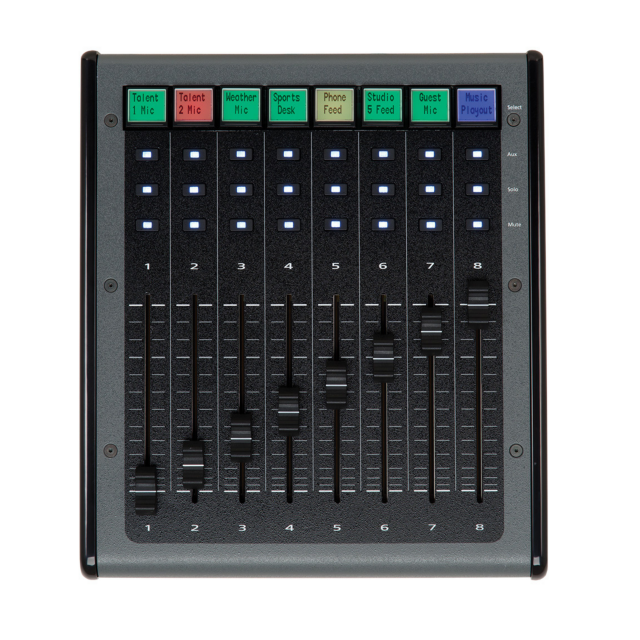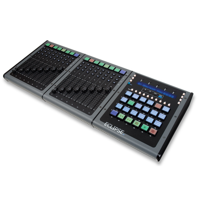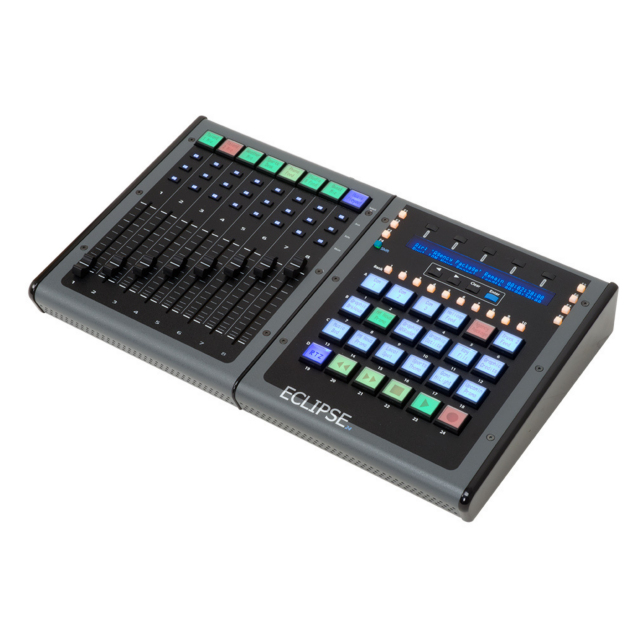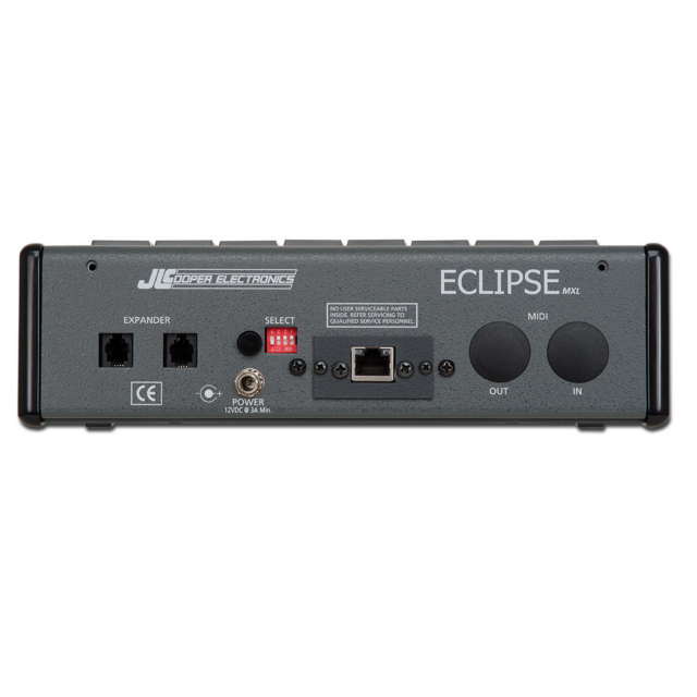 The LCD buttons can display 64 colors and up to 32 characters of text and graphics. A separately available compact USB, 10/100 Ethernet, RS-232, or RS-422 interface card is required for functionality and to provide a connection to your host system. The fader controller is compatible with Peavey MediaMatrix NWare software, L-S-B Virtual Studio Manager, Mosart, Sony's ELC Enhanced Live Production Control System, and other applications. The Eclipse MXL Midnight 8-Channel Fader Expander connects to the host computer via the Expansion Slot. It is powered from the supplied 12V power adapter.
