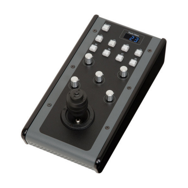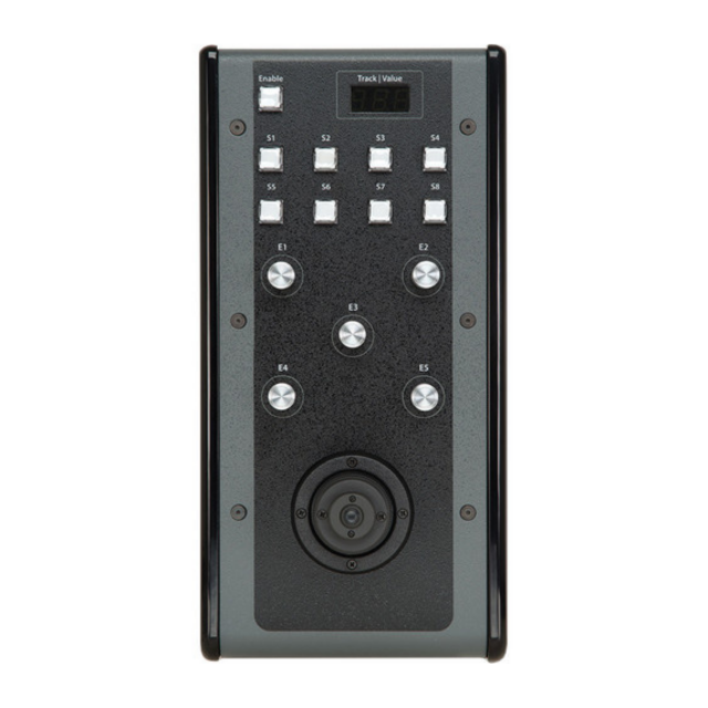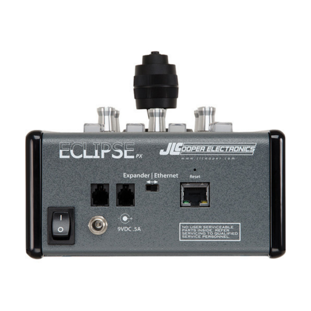 The Eclipse PX Surround Panning Joystick Controller from JLCooper combines a high-quality, 3-axis joystick with 5 touch-sensitive, push-button, rotary encoders, 9 illuminated buttons and a 3-digit white LED display for indicating the track number.
