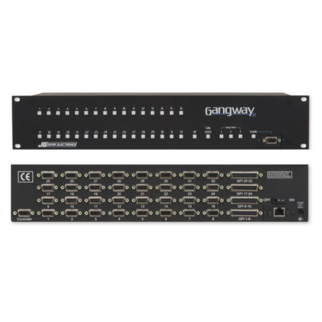 The GangWay32 32-Port RS-422 Gang Roll Switcher and GPI Trigger Box from JLCooper offers front panel deck controls that let you simultaneously select up to 32 VTRs, DDRs, or server channels. The front panel includes illuminated buttons for clear status indication for each machine, and a front-mounted RS-422 port provided for convenient remote connection. The rear panel contains the 32 RS-422 ports, an RS-422 control input, and GPI (General Purpose Interface) ports.