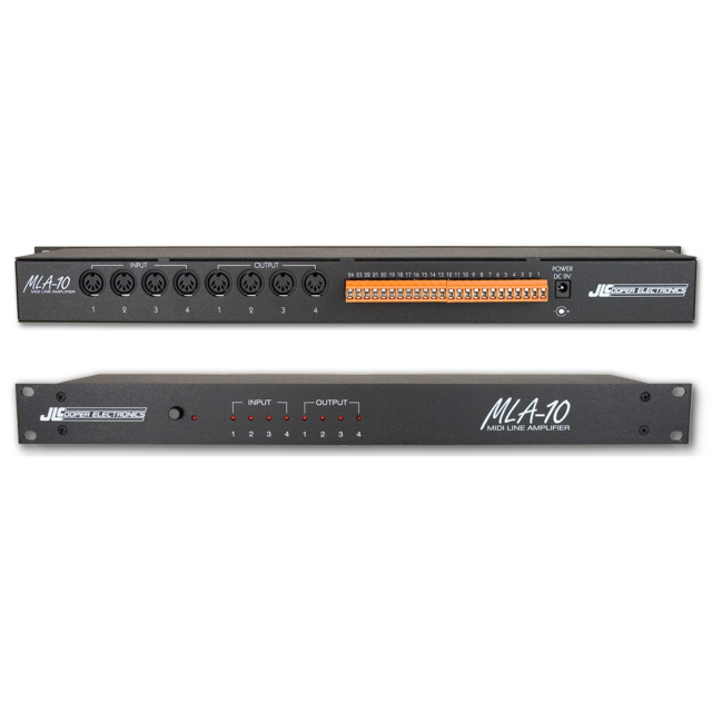 The MLA-10 from JL Cooper is a MIDI line amplifier, featuring four MIDI inputs and four MIDI outputs that can be sent through 1,000 feet or more of common twisted pair wire. For large installations, the 50 foot limit of standard MIDI transmission can now be overcome.